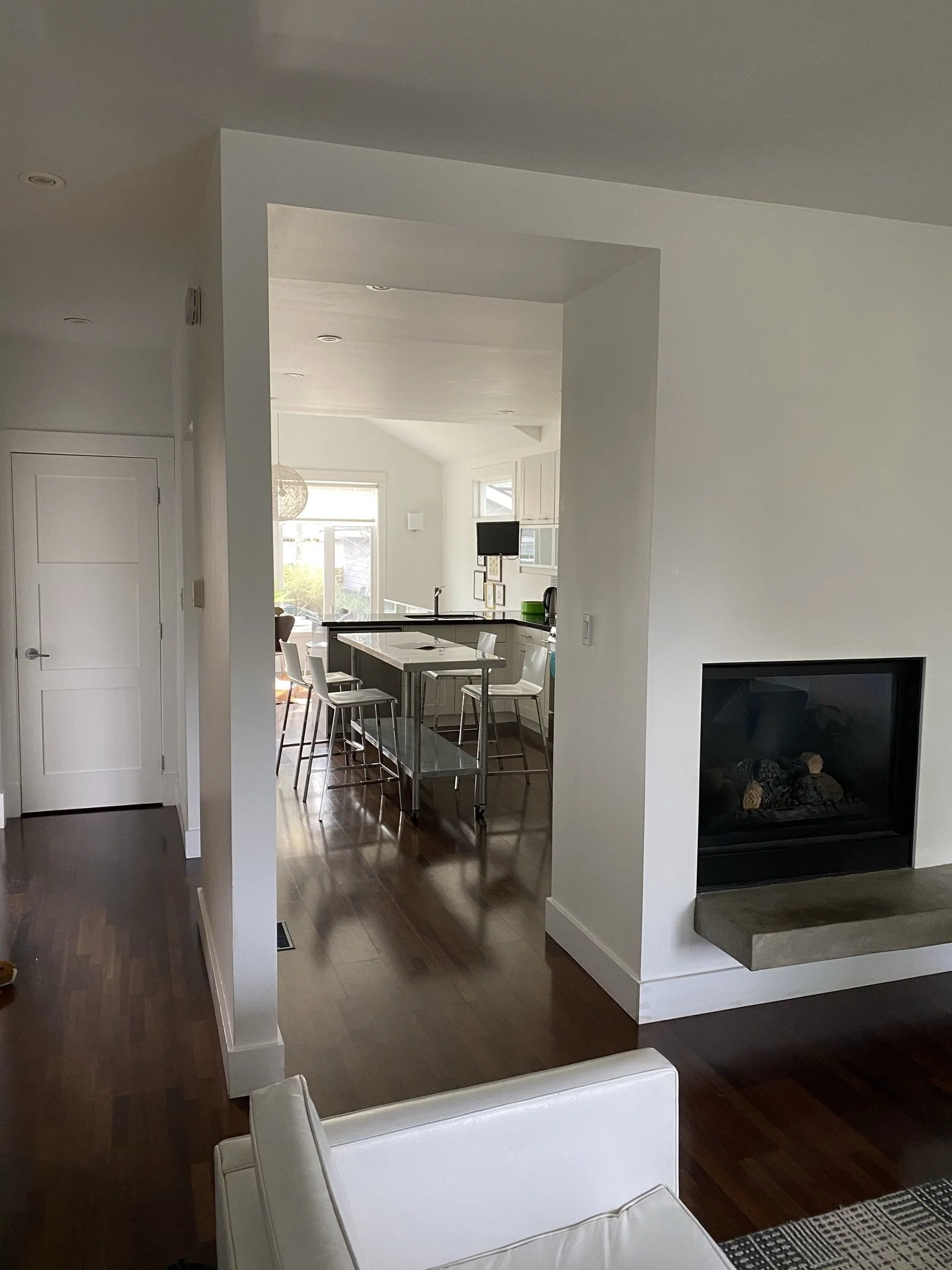 They also wanted to reconfigure and renovate a cramped bathroom to make it more comfortable and efficient. To complete the transformation, the homeowners asked for refinishing of the main floor, including new flooring throughout and on the stairs leading upstairs, as well as the addition of a new gas fireplace to create a warm and welcoming focal point in the living area.