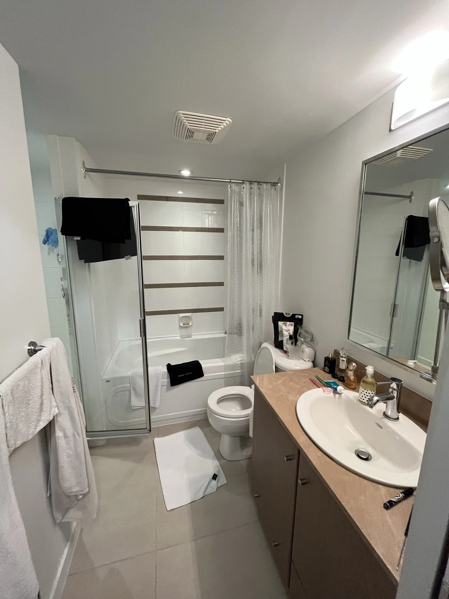 One of the priorities was reconfiguring the ensuite bathroom to allow for a double vanity, bringing both comfort and elegance to daily routines. Millwork was designed throughout the home, complemented by the addition of a custom bar for entertaining. The staircase was upgraded with a sleek glass guardrail and LED-lit handrail, while herringbone flooring tied the entire unit together with timeless style. Finally, removing multiple walls created the open, flowing layout the clients had always wanted.