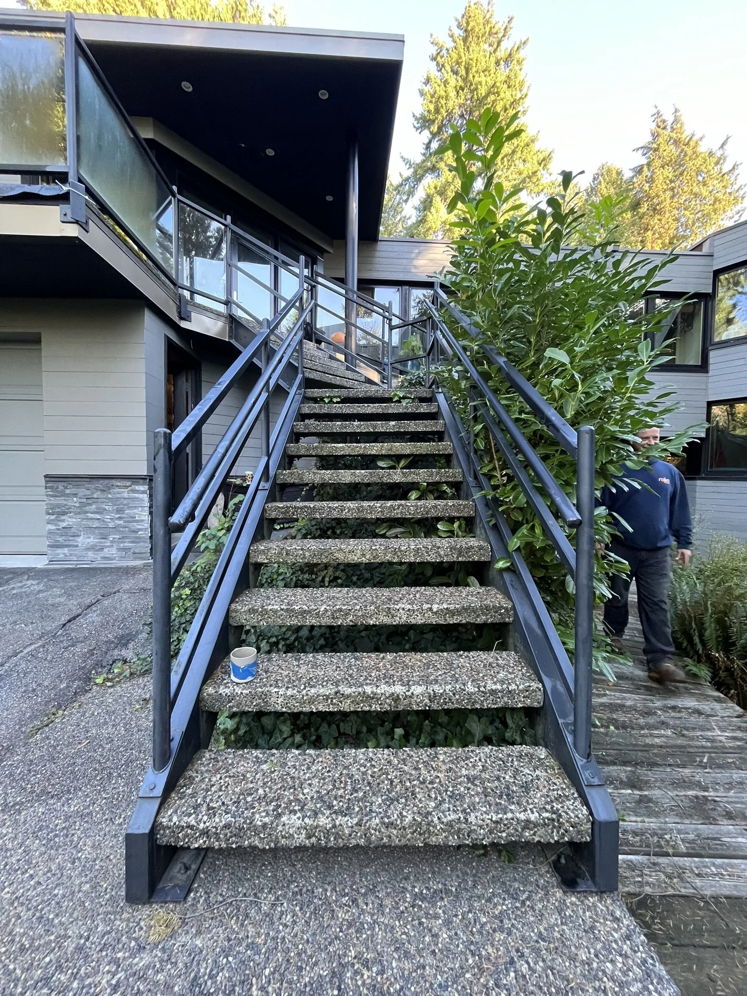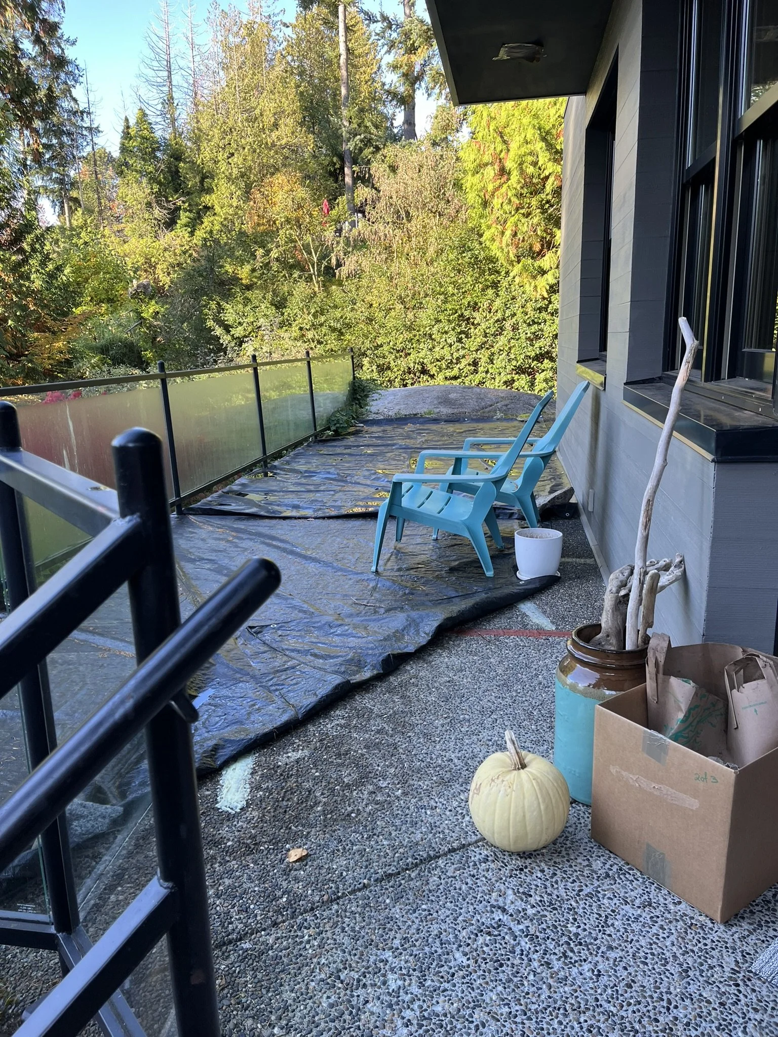 They wanted the leaking patio replaced with a new concrete structure that extended around the side of the house to the back, creating a larger outdoor living area. To finish the space, they asked for a modern glass guardrail to provide safety without obstructing views and updated stairs to match the refreshed design. At the same time, they wanted the deteriorating beam in the garage properly repaired to ensure the front of the home remained structurally sound.